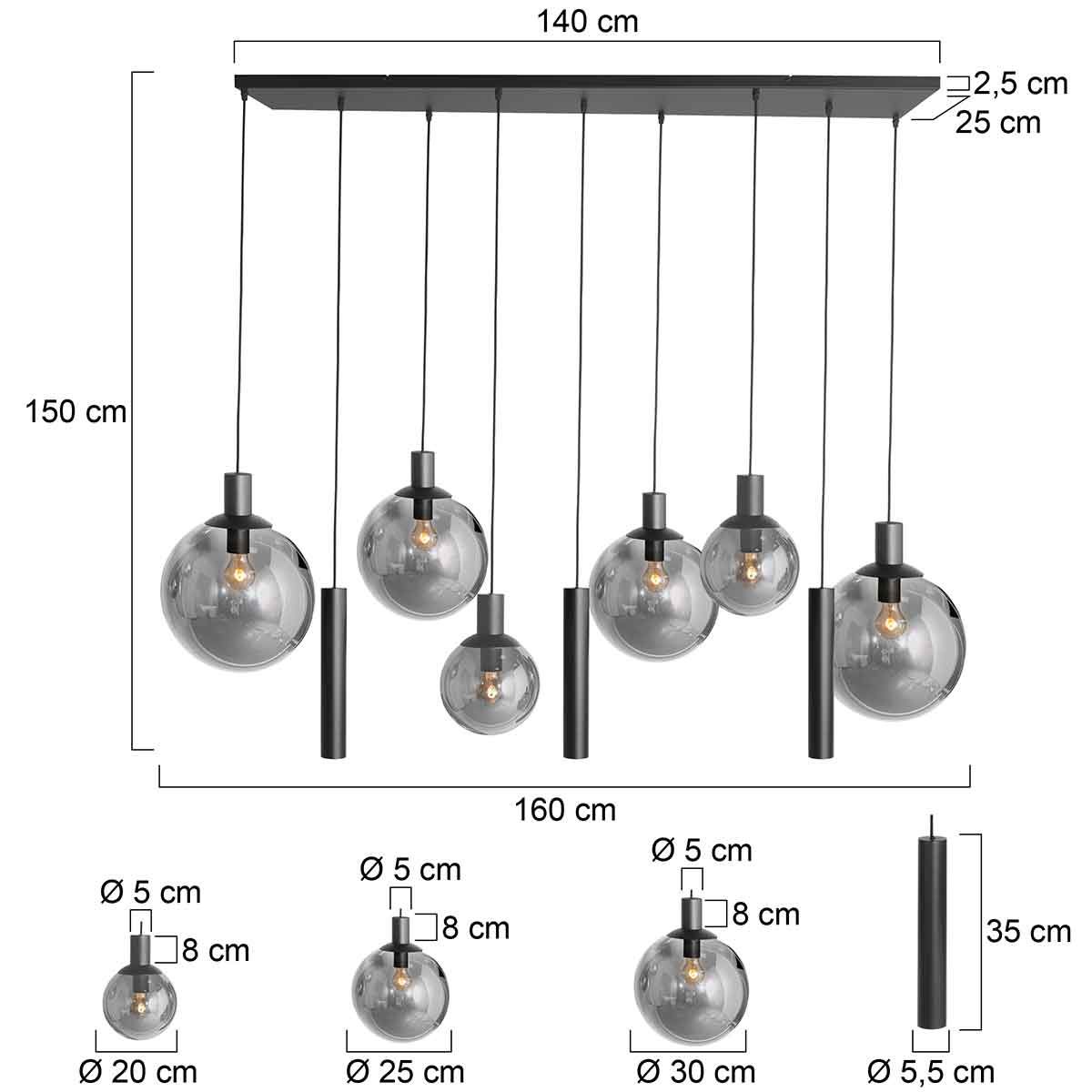 Geef je eetkamer een krachtige uitstraling met de Zwarte Hanglamp Bollique 3798ZW. Deze indrukwekkende lamp, perfect boven grotere tafels, bestaat uit 6 glazen bollen en 3 kokers. De kokers zorgen voor helder direct licht op de tafel, terwijl de bollen de ruimte sfeervol verlichten. De smokekleurige, iets spiegelende bollen hebben drie verschillende maten: 20, 25 en 30 cm. Voor de kokers worden de lichtbronnen meegeleverd: 3 x 4,9 W, dim to warm (2200 tot 2700 Kelvin) en maximaal 480 lumen.Β