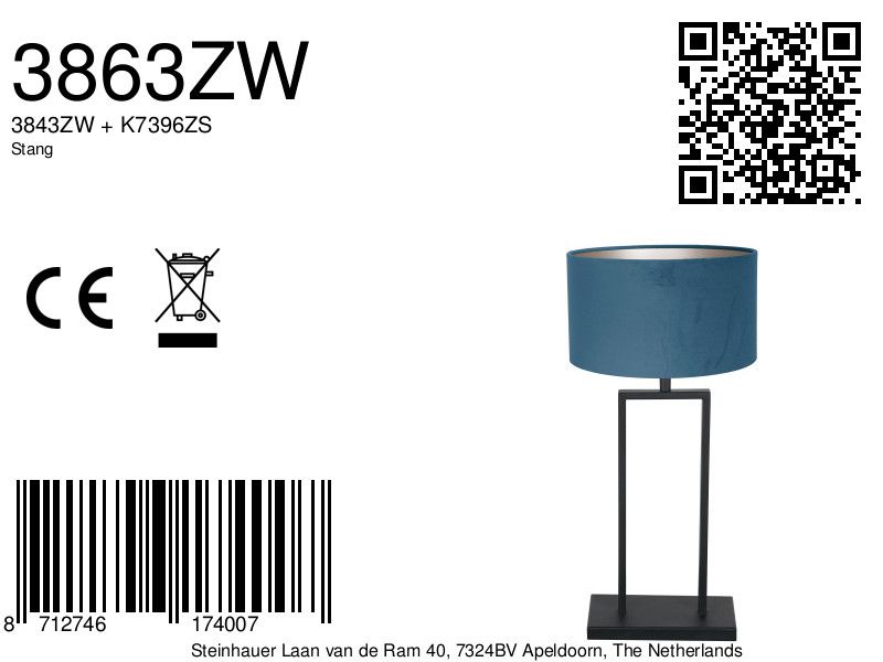 Tafellamp + Lampenkap - Stang - 3863ZW - Zwart/ Blauw - Metaal/ Velours